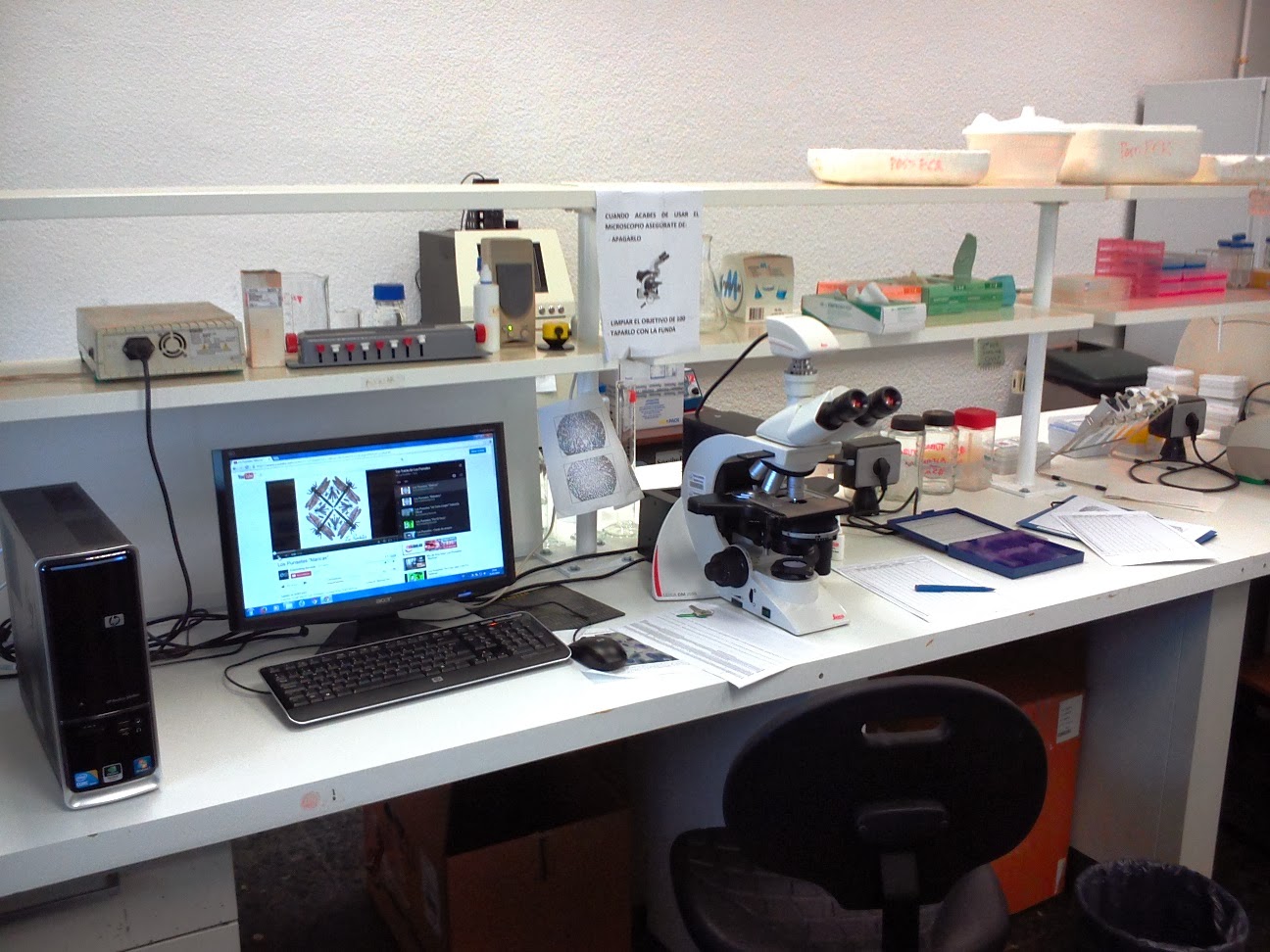 A pesar del frío, combatido como se puede con la estufa de aire caliente; un par de detalles hacen más agradables ahora que antes las horas sentado delante del microscopio. Una es la nueva silla con respaldo que se ve en la imagen y que sustituye a las mortificadoras banquetas de madera; y otra que, al tener ahora Internet en el ordenador del laboratorio, el espectro musical disponible ha aumentando significativamente. Y así echaré las horas hasta que termine con todos los frotis o me rescaten aceptándome en algún postdoc: disimulando con RockFM cuando haya alguien más en el laboratorio o coreando en voz alta las rimas consonantes y obsesivas de Los Punsetes cuando no haya nadie... no sé qué pinta tendré si entra alguien sin que yo me dé cuenta.